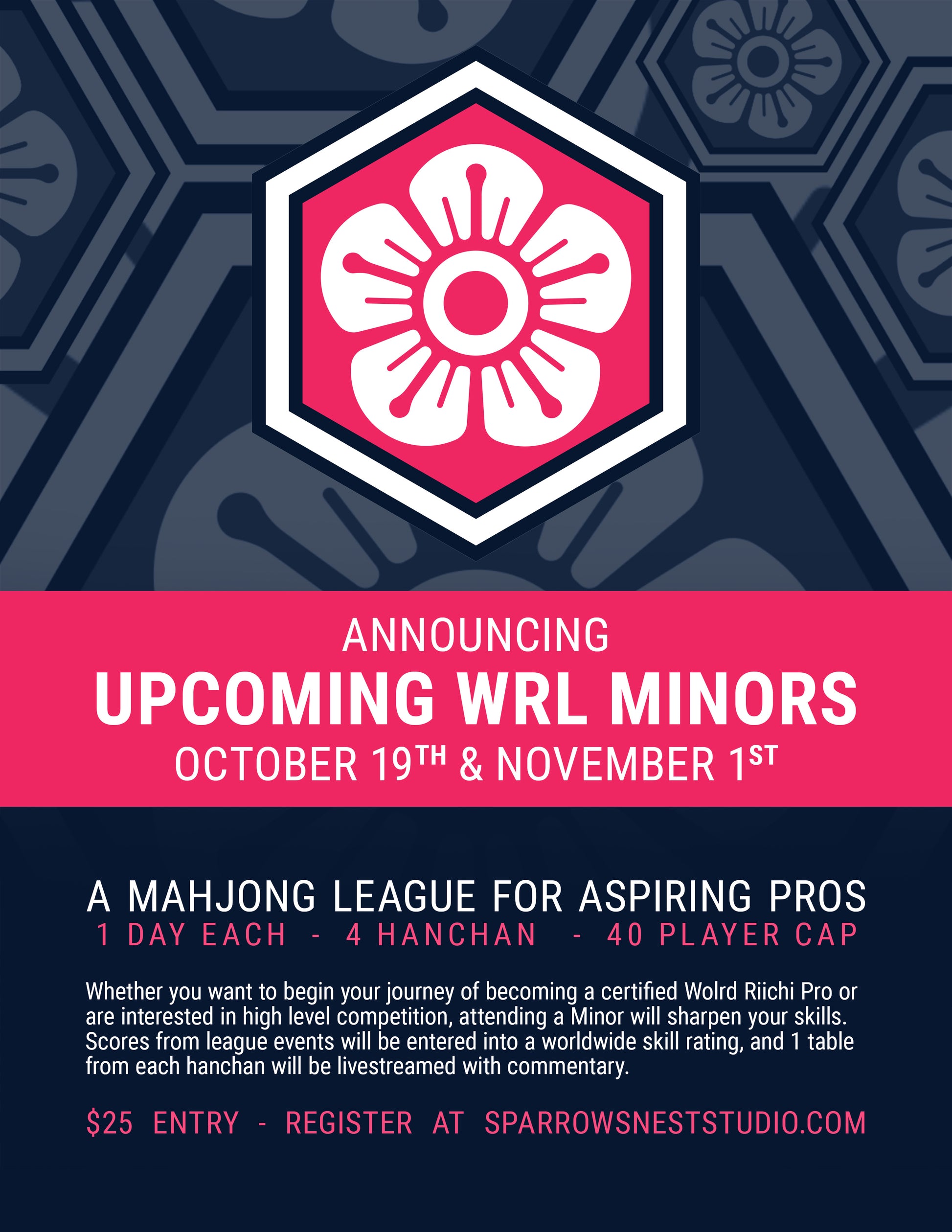 Our October World Riichi League minors has been scheduled here at Sparrow's Nest. Your entry includes 4 hanchan of high level competitive play, and free play in the evening after the event.